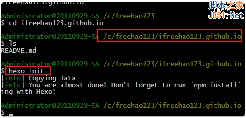 3、安裝成功后,執(zhí)行以下代碼指定Hexo到文件目錄中:hexo init folder>,或者用CD的方法進(jìn)入到指定的目錄,再執(zhí)行:hexo init