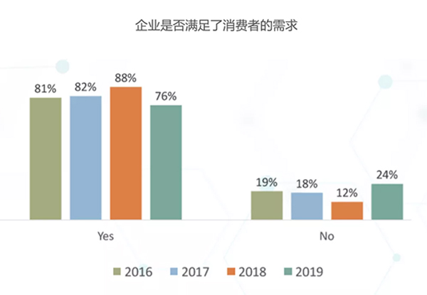 當(dāng)被問(wèn)及“企業(yè)是否滿(mǎn)足了消費(fèi)者的需求?”,2019年調(diào)查的結(jié)果僅為76%,是自2014年以來(lái)回答“是”的企業(yè)占比最少的一次。造成這種結(jié)果的原因可能是行業(yè)內(nèi)部以及消費(fèi)者期望之間的不斷變化。