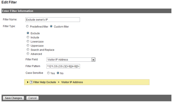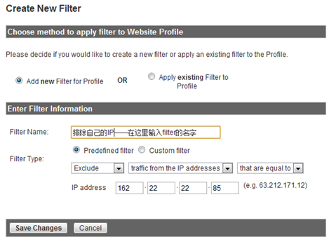 這里,我們在Filter Pattern中用到了正則表達式:^121\.33\.(33\.(3[3-9]|[4-9][0-9]|1([0-9][0-9])|2([0-4][0-9]|5[0-5]))|((3[4-7])\.([0-9]|[1-9][0-9]|1([0-9][0-9])|2([0-4][0-9]|5[0-5])))|38\.([0-9]|[1-9][0-9]|1([0-9][0-9])|2([0-4][0-9]|5[0-4])))$。哈哈,可怕吧!別擔心,其實你訪問這個地址,就能自動生成你IP段的正則表達式了:https://www.google.com/support/googleanalytics/bin/answer.py?answer=55572hl=en_USutm_id=ad。Google自己的這個工具很好用。