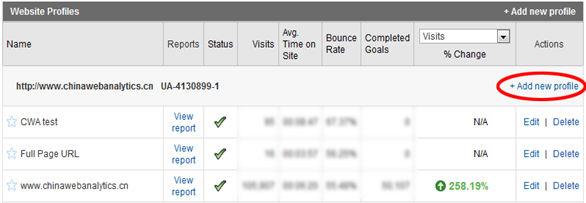 直接在同一個GA ID(例如我的GA ID是UA-4130899-1)后面點擊“+ Add new profile”,然后在下圖(圖2)中輸入你想要的profile的名字,然后點擊continue之后保存就行了。