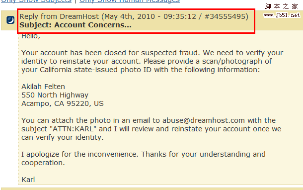 然后2010年5月4日收到了Dreamhost客服的suspected farud,就是懷疑欺詐啦,然后這個(gè)帳號(hào)就掛了……