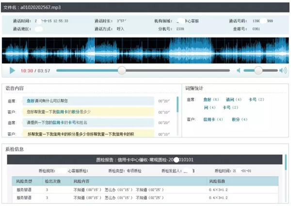 以人工抽檢為主的傳統(tǒng)質(zhì)檢,一個(gè)質(zhì)檢員每天最多檢測(cè)50個(gè)錄音文件,而抽檢比例僅能達(dá)到1-8%,如管中窺豹。存在人工成本高、覆蓋率低、質(zhì)檢效果差、問(wèn)題發(fā)現(xiàn)慢、數(shù)據(jù)匯總難等等缺點(diǎn)。在客戶需求多樣化、運(yùn)營(yíng)管理精細(xì)化的今天,純?nèi)斯べ|(zhì)檢方式難以滿足要求。尤其在金融、保險(xiǎn)、銀行等行業(yè),擁有海量的音頻錄音文件,客服人員管理上更嚴(yán)謹(jǐn),對(duì)話術(shù)及溝通事項(xiàng)有嚴(yán)格的規(guī)范化要求。