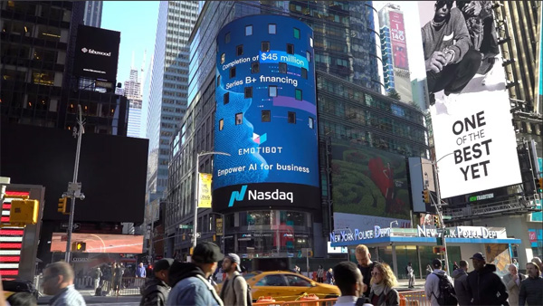 美國東部時間11月6日,竹間智能榮登紐約時代廣場納斯達(dá)克大屏,重磅發(fā)布B+輪4500萬美元融資消息,亮相國際舞臺。