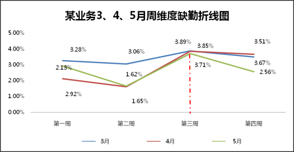 比如:提供一組周維度數(shù)據(jù)甄別案例:如下圖所示,連續(xù)多個月的第三周突起,這就是顯而易見的找到了數(shù)據(jù)異常點,數(shù)據(jù)可以幫我們快速定義時間周期,再通過缺勤事件的收集,就可以尋找根本問題了。
