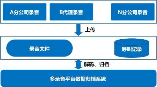 在不改變現(xiàn)有各分公司(或代理公司)錄音平臺系統(tǒng)架構(gòu)的基礎(chǔ)上,集中歸檔各錄音平臺數(shù)據(jù)并提供統(tǒng)一用戶界面實現(xiàn)對歸檔的錄音資料查詢、回復、下載等應(yīng)用。