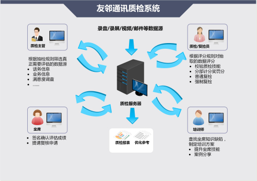 構(gòu)建了質(zhì)檢主管、質(zhì)檢員/復檢員、培訓師、坐席等多種角色之間工作、交流和學習的平臺,實現(xiàn)各角色間數(shù)據(jù)實時共享自動流轉(zhuǎn)。