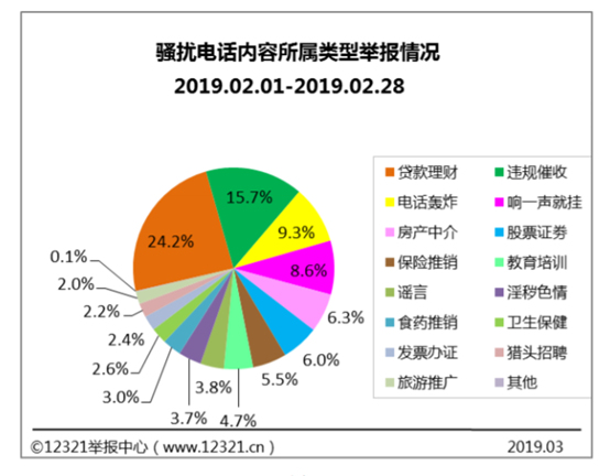 根據(jù)12321舉報(bào)中心發(fā)布的最近一次月報(bào)顯示,2019年2月,共收到騷擾電話舉報(bào)3.7萬(wàn)次,其中內(nèi)容為貸款理財(cái)類、違規(guī)催收類和電話轟炸類的舉報(bào)信息居前三位,占比分別為24.2%、15.7%和9.3%。