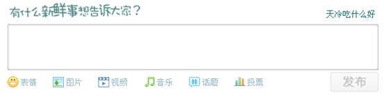 通常信息的產(chǎn)生都來源于信息輸入?yún)^(qū)域,現(xiàn)在主要的一些SNS應(yīng)用都少不了這個主要輸入步驟,也是整個網(wǎng)站產(chǎn)生內(nèi)容的基礎(chǔ)所在。一般都有發(fā)布框、動作行為的簡單輸入按鈕等。