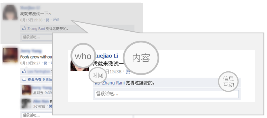 如果把sns網(wǎng)站中的feed按照這個方式來提煉,那么每條信息可以重點簡化為“誰說了什么,在什么時間(什么地點/通過什么方式)”當(dāng)然sns是少不了用戶的互動,因此還有一個信息互動模塊。總結(jié)每條信息的構(gòu)成主要由“人+內(nèi)容+時間(地點/來源/方式)+信息互動”。