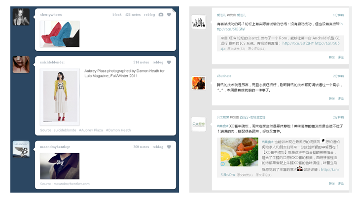 Tumblr和輕博客,則是在視覺上通過明顯的色塊區(qū)分來強調(diào)信息區(qū)塊,能夠明顯感受到內(nèi)容清晰,閱讀順暢,提高獲取信息的效率。