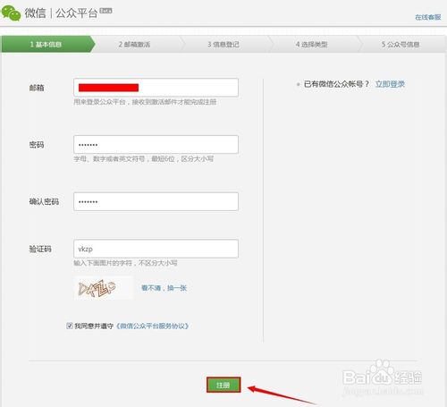 輸入你要的郵箱地址,和登陸微信公眾平臺的密碼。點擊【注冊】