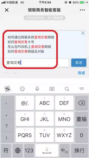 首先,用戶輸入問題時(shí),如用戶要查詢交易卡號,輸入“查詢交易”后,輸入欄上方就會(huì)出現(xiàn)與“查詢交易”相關(guān)的完整問題,其中就包括“如何查詢交易卡號”,用戶只需點(diǎn)擊即可獲取答案。