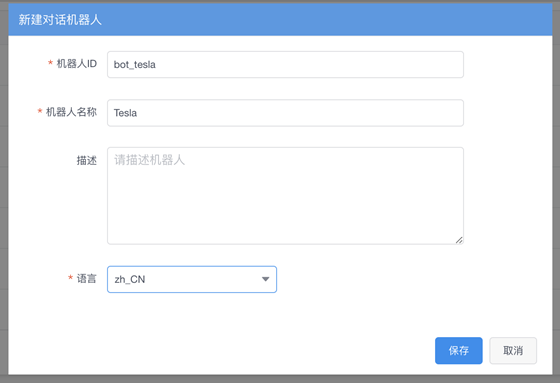| primaryLanguage | 是 | string | 機(jī)器人的語言,現(xiàn)在支持兩個(gè)選項(xiàng):["zh_CN", "en_US"],分別代表中文和英文。 |