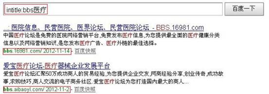 看到這里,可能會有很多seoer向筆者吐槽了:外鏈資源而已,我多的是,何必還要搜集?現(xiàn)在的百度對外鏈的管理已經(jīng)越來越嚴(yán)格了,先不說你以前的資源還能不能用,你認(rèn)為你的外鏈資源一定符合你所接的seo單子的行業(yè)?外鏈的相關(guān)性很重要,搜集外鏈資源不是盲目的,而是必須找到與行業(yè)相關(guān)的。搜集外鏈資源的方法很多,筆者在這里分享一種尋找論壇資源的、比較簡單的方法,就是用利用百度搜索指令,比如我是做醫(yī)療行業(yè)的seo,我要尋找醫(yī)療論壇,就可以在百度輸入“intitle:bbs醫(yī)療”,然后就會出現(xiàn)一大堆醫(yī)療論壇: