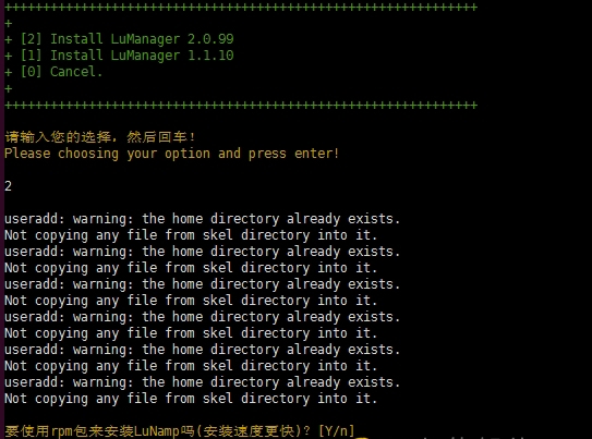 這里我們需要選擇當(dāng)前的LUM版本,目前已經(jīng)有2.0版本最新的,輸入對(duì)應(yīng)的數(shù)字回車(chē),然后我們輸入Y回車(chē)從RPM快速安裝,這樣的安裝速度比較快。