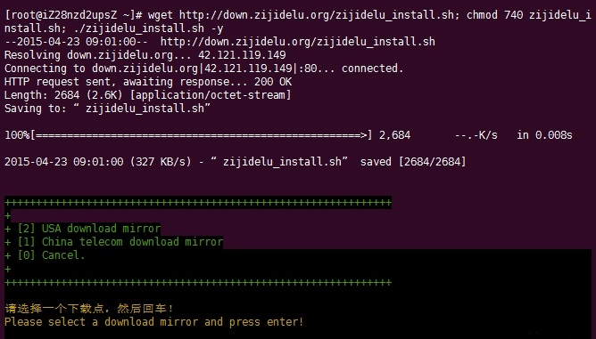 wget http://down.zijidelu.org/zijidelu_install.sh; chmod 740 zijidelu_install.sh; ./zijidelu_install.sh -y