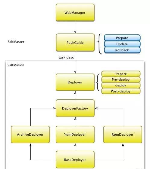 發(fā)布系統(tǒng)前端通過salt api與salt master進(jìn)行通信, 發(fā)布任務(wù)描述信息到salt master。salt master通過salt命令調(diào)用我們自己開發(fā)的模塊來完成一次發(fā)布任務(wù)。
