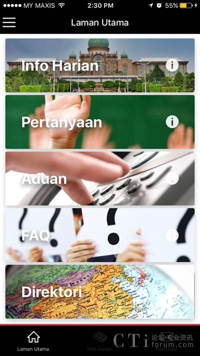 SITI@1MOC手機(jī)應(yīng)用程序共有五個(gè)選項(xiàng),包括每日資訊、詢問、投訴、常見問題及目錄。(圖:星洲日?qǐng)?bào))