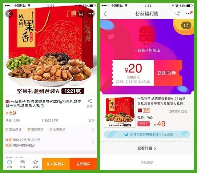 零食:圖中這家天貓店的堅果零食,你自己去天貓店買需要69元,而可以領(lǐng)到20元內(nèi)部優(yōu)惠券,也就是說只需要49元就可以購買到這份堅果禮盒組合裝!