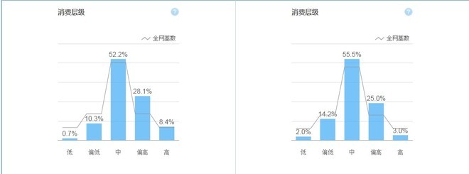 柱形是這個(gè)詞的消費(fèi)基數(shù),線型全網(wǎng)的消費(fèi)基數(shù)?;旧隙际侵袑酉M(fèi)等級(jí)居多。