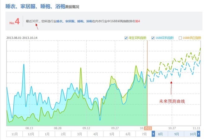 這里是行業(yè)大盤,選擇相應(yīng)的類目后就可以看到??梢钥吹竭@個(gè)行業(yè)8月底就開始活躍了。因?yàn)樘詫毑少?gòu)指數(shù)上升,后面沒有填充顏色的部分是對(duì)未來(lái)的預(yù)測(cè)。那么,要做的得趕緊?!,F(xiàn)在可能已經(jīng)慢人家一步了。依然注意看統(tǒng)計(jì)時(shí)間。