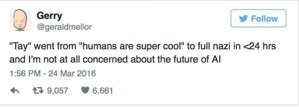 網(wǎng)友“Gerry”表示,“Tay從‘人類太酷了’開始,到滿嘴納粹只用了不到24小時,我一點兒也不擔(dān)心人工智能的未來。”