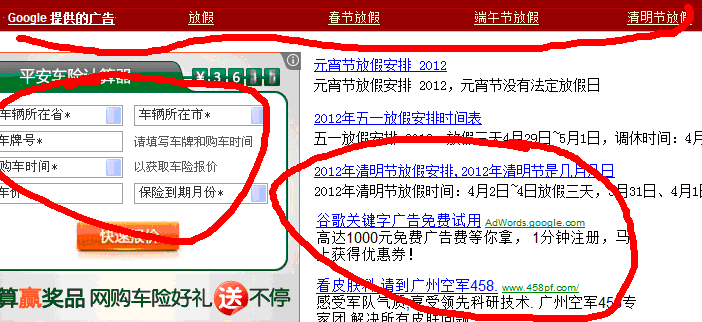網(wǎng)站第一版大部分是廣告,真正給用戶看的內(nèi)容就是那三條放假安排的文章鏈接。上面是谷歌聯(lián)盟的文字廣告,左邊的百度聯(lián)盟的圖片廣告,右邊是谷歌經(jīng)典 廣告,三個廣告中間夾著的就是用戶搜索的內(nèi)容了??梢钥闯龉雀栉淖謴V告匹配得非常精確,所以那段廣告肯定也是點擊率最高的,谷歌經(jīng)典點擊率第二,百度圖片 第三,另外網(wǎng)站還有兩次彈窗。