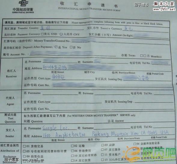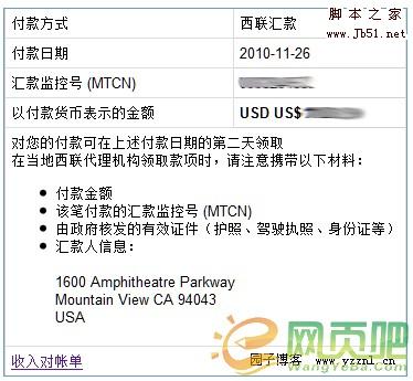 Adsense 目前只提供兩種付款方式,一種就是通過郵寄支票來支付廣告費(fèi),另一種就是園子要介紹的西聯(lián)匯款了。使用郵寄有個很大的缺點(diǎn),就是時效性,有可能在一個月左右才能收到支票,并且采用安全快遞的話還有 US$25.00 手續(xù)費(fèi),顯然這對站長們來說是個不太公平的收費(fèi)方式。