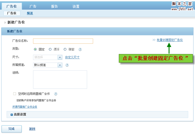 巨人網(wǎng)絡(luò)通訊聲明:本文標(biāo)題《百度聯(lián)盟批量創(chuàng)建固定廣告位的圖文教程》,本文關(guān)鍵詞 百度,聯(lián)盟,批量,創(chuàng)建,固定,;如發(fā)現(xiàn)本文內(nèi)容存在版權(quán)問題,煩請?zhí)峁┫嚓P(guān)信息告之我們,我們將及時(shí)溝通與處理。本站內(nèi)容系統(tǒng)采集于網(wǎng)絡(luò),涉及言論、版權(quán)與本站無關(guān)。