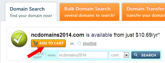 看到首頁(yè)的上圖,輸入自己需要注冊(cè)的域名以及后綴,點(diǎn)擊SEARCH按鈕檢測(cè)是否被注冊(cè);順便說(shuō)一下,如果需要轉(zhuǎn)入,看到上圖的DOMAIN TRANSFER按鈕之后就是轉(zhuǎn)入域名步驟;