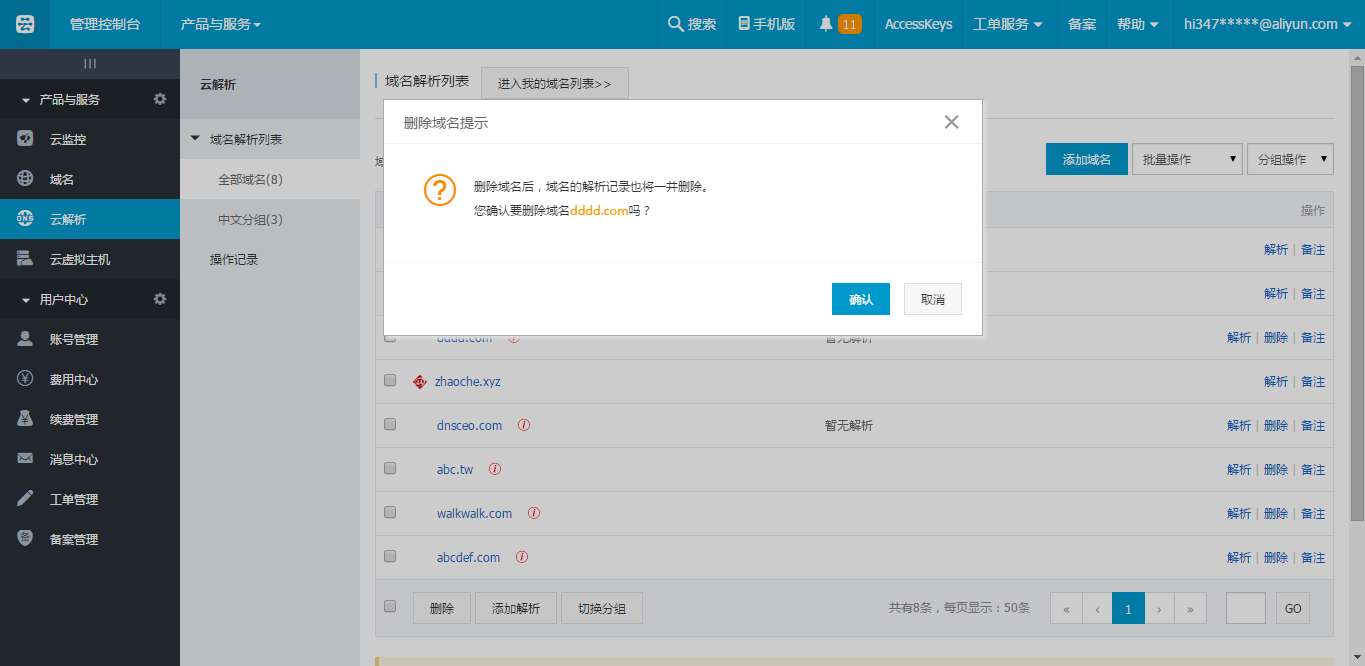 點(diǎn)擊”確認(rèn)“后,域名連同其解析記錄全部刪除。
