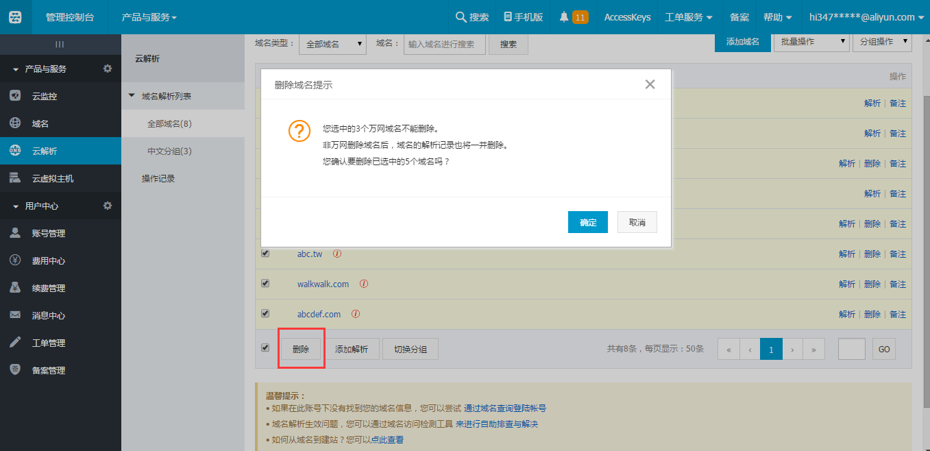 【注意】因?yàn)槿f網(wǎng)域名不允許刪除,因此在批量刪除中如果存在萬網(wǎng)域名,則提示用戶,相應(yīng)數(shù)量的萬網(wǎng)域名無法刪除。