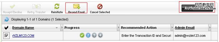 10、授權(quán)轉(zhuǎn)移。勾選你需要轉(zhuǎn)移的域名的前面的復(fù)選框,然后單擊“Authorization”(授權(quán))菜單下的“Begin Transfer Authorization”項(xiàng)。
