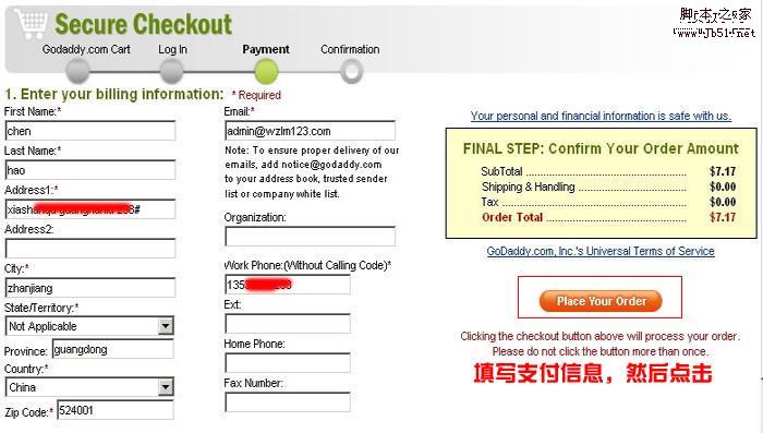 7、確認(rèn)支付信息。這里填寫Email是用來收取GODADDY的訂單和域名處理狀態(tài)的郵件。接著點(diǎn)擊“Place Your Order”就跳轉(zhuǎn)到支付寶支付頁面,輸入支付寶帳號和支付密碼完成付款。注意:支付付款請使用IE內(nèi)核瀏覽器。