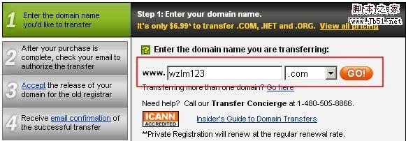 3、輸入需要轉(zhuǎn)移的域名。比如我要轉(zhuǎn)移的域名是 www.wzlm123.com,然后點(diǎn)擊GO!