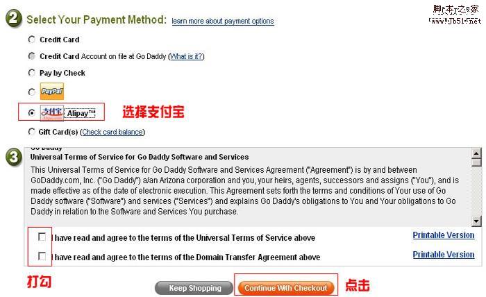 6、選擇付款方式。轉(zhuǎn)域名到godaddy 需要支付一年的域名服務(wù)費(fèi):$7.19?,F(xiàn)在開始GD已經(jīng)支持支付寶付款,建議選擇支付寶或者Paypal付款,這兩種方式相對安全,我選擇是支付寶付款。非常方便,安全有保證。(注意:在付款之前,確保您的域名是解鎖狀態(tài)并且已經(jīng)拿到原注冊商轉(zhuǎn)移碼,請查看文章底部附加說明)