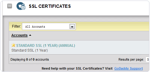 1.登錄到GoDaddy賬戶后,在“ssl certificates”一欄里我們可以按到自己購(gòu)買(mǎi)的SSL證書(shū)。如圖所示: