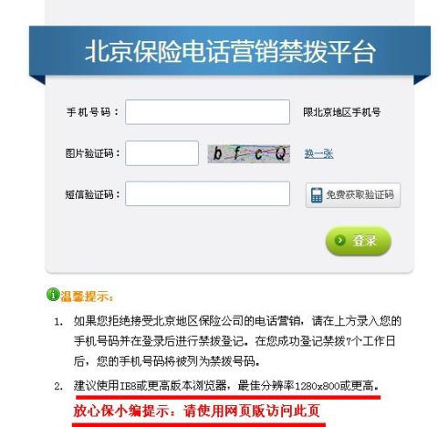 2012年9月,北京保險(xiǎn)行業(yè)協(xié)會(huì)宣布開(kāi)通北京人身保險(xiǎn)電話營(yíng)銷禁撥號(hào)碼登記平臺(tái)(以下簡(jiǎn)稱“禁撥號(hào)碼登記平臺(tái)”)。這是北京保險(xiǎn)行業(yè)應(yīng)對(duì)電銷“擾民”的重要舉措。此后,北京地區(qū)消費(fèi)者如不愿接受保險(xiǎn)電話銷售,便可以通過(guò)北京保險(xiǎn)行業(yè)協(xié)會(huì)網(wǎng)站登錄禁撥平臺(tái),登記個(gè)人號(hào)碼申請(qǐng)禁止撥打。如果您拒絕接受北京地區(qū)保險(xiǎn)公司的電話營(yíng)銷,可以錄入您的手機(jī)號(hào)碼并在登錄后進(jìn)行禁撥登記。在您成功登記禁撥7個(gè)工作日后,您的手機(jī)號(hào)碼將被列為禁撥號(hào)碼。特別要提醒的是,壽險(xiǎn)和車險(xiǎn)的禁撥號(hào)碼,是要分別設(shè)置的,如果您想徹底遠(yuǎn)離保險(xiǎn)推銷電話,一定別忘了設(shè)置齊嘍!