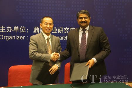 天津鼎韜外包服務有限公司總裁齊海濤先生與NASSCOM中國指導委員Ramgopal Natarajan上臺進行簽字儀式