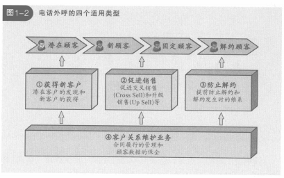 因此,如果從顧客培養(yǎng)、維持的角度出發(fā),電話外呼可以分為4個適用型,如圖1-2所示。一般的客戶都是按照潛在顧客、新顧客、固定顧客、解約顧客這樣一種周期來變化的。根據(jù)客戶處于的周期階段,企業(yè)方面可相應(yīng)采取的電話外呼措施分為以下4個方面。