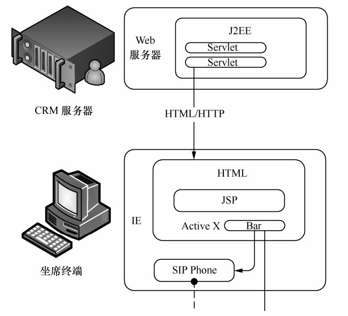 坐席電話控制:坐席電話有很多種,常見的有3種:第一種是安裝在坐席PC外的普通的固定電話;第二種是安裝在坐席PC機內獨立的SIP軟電話;第三種就是內置在坐席所用的電話條中的專用SIP軟電話。對普通固定電話和獨立的SIP軟電話的控制一般完全基于話務員對這兩種設備的手工操作,CRM應用無法參與。但CRM應用可以參與對內嵌在電話條中專用SIP軟電話的控制,如在來電振鈴時,CRM應用可以通過其在IE中的頁面指示這個軟電話摘機接聽,還可以指示這個軟電話去外呼某個電話號碼。應用對坐席電話(包括電話條)的控制,是通過CRM的坐席Web頁面程序(如JSP)調用嵌入在Web頁面中呼叫中心電話條Active X控件的API接口來完成的,