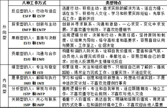 根據(jù)這些特征要求,我們?cè)囍鴱腗BTI16種性格類型的8種工作方式上來逐一篩選: