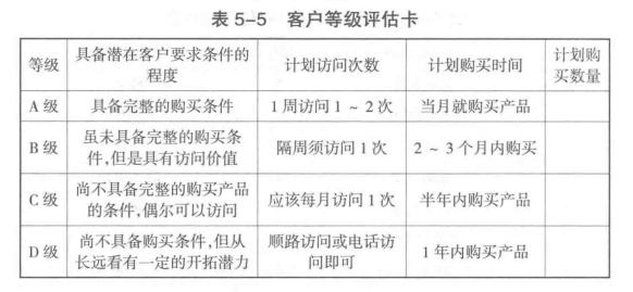 推銷人員可根據(jù)有關(guān)標(biāo)準(zhǔn)將潛在客戶分為A、B、C、D這樣的等級進(jìn)行分級管理,如表5-5所示。這里的標(biāo)準(zhǔn)可以根據(jù)不同行業(yè)具體情況而定,如客戶規(guī)模大小、購買能力大小、信用高低、購買概率高低、距離遠(yuǎn)近、可能長期合作與否等。通過客戶分類,可使推銷人員的日常工作計劃化、程序化、條例化、系統(tǒng)化,有助于開展重點推銷和目標(biāo)管理。