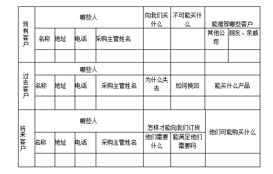 推銷人員可以將長期積累的客戶按照時間分為三類:現(xiàn)有客戶、過去客戶、將來客戶,對每一類客戶資料都要詳細(xì)分析,力求從中發(fā)現(xiàn)產(chǎn)品銷售機(jī)會。內(nèi)容如表5-1所示。