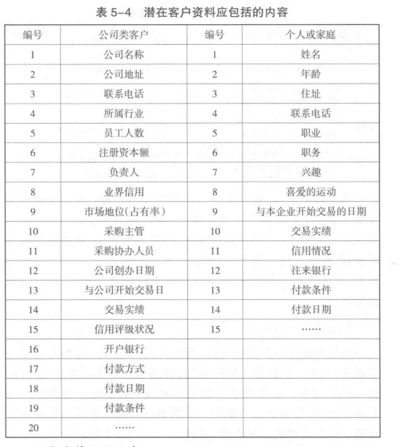 客戶資料卡(包括個人和公司)應(yīng)包括表5-4中羅列的內(nèi)容。