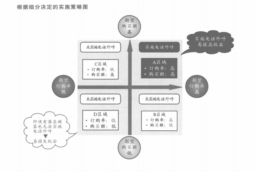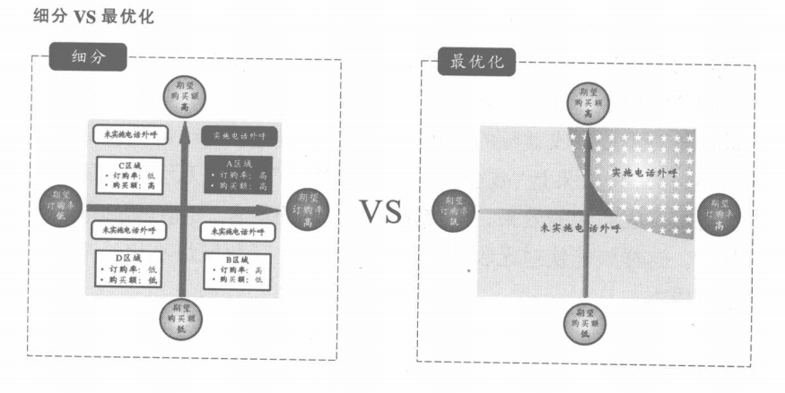 細分和最優(yōu)化最大的區(qū)別在于實施決策的單位不同。細分是對顧客劃分類別后的每個部分確定實施策略,而最優(yōu)化是對每位顧客確定實施策略。下頁圖分別以兩根數(shù)軸——期望訂購率和期望購買額,來顯示對顧客的評價。細分是根據(jù)期望購買額和訂購率的高低進行分類,確定實施策略的。在該例中,我們劃分為四組,僅對期望訂購率和購買額都很高的A部分實施電話外呼,其他的部分就不實施電話外呼。對A區(qū)域進行電話外呼的結(jié)果的確比隨機撥打好,能體現(xiàn)細分的效果。另一方面,如果對B-D區(qū)域的顧客實施電話外呼,也會有提高收益的潛在顧客存在,但還是沒有對其實施電話外呼。也就是說,由于細分是將顧客分組化,因此也有可能將能提高收益貢獻的潛在顧客分在了錯誤的組,造成實施策略微調(diào)的難度和機會損失的發(fā)生。