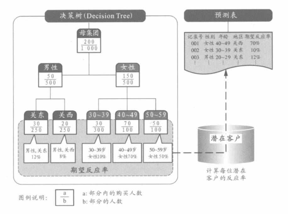 預(yù)測表是顧客將發(fā)生某種行動的概率(期望反應(yīng)率)一覽表。要制作預(yù)測表,需先使用統(tǒng)計的分析方法構(gòu)建顧客行動模式,以該模式為基礎(chǔ),通過打分來算出每個顧客的期望反應(yīng)率(預(yù)測值)。較容易理解的例子就是決策樹"(DecisionTree)。決策樹是通過樹形圖來表示數(shù)據(jù)。項目間的因果關(guān)系,同時計算出不同屬性顧客的期望反應(yīng)率。制作顧客行動模式時,一般運用市場上銷售的數(shù)據(jù)挖掘軟件,如MarketSwitch公司銷售的TrueforTransactionModeling(TTM)等。