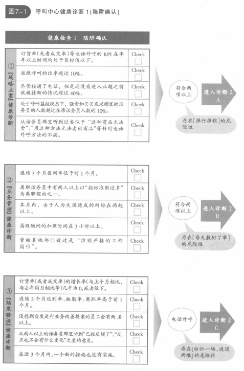 呼叫中心,它的各種指標、電話現(xiàn)場的主管,以及話務員的行動中,都會露出問題的端倪。圖7-1中的問題項目,是對落入陷阱的顯著癥狀的一個總結。