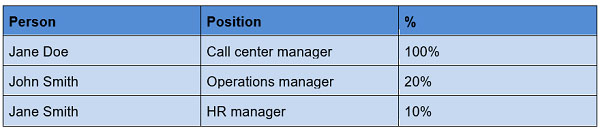 - 列出您預(yù)期將參與該項目實施的所有個人(或職位),以及您希望專注于該項目的時間。例如: