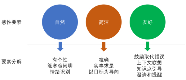 對話交互產(chǎn)品化的本質(zhì),是主動通過標(biāo)準(zhǔn)化產(chǎn)品手段讓機(jī)器人達(dá)到對話交互智能。對于用戶來說,核心體驗集中在與客服機(jī)器人的對話交互上;根據(jù)我們經(jīng)驗,我們將交互智能列為如下三個感性要素: